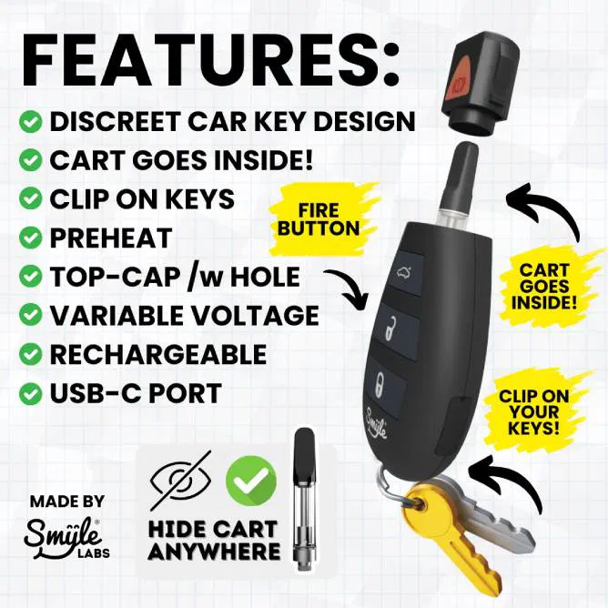 Whether you’re at home or on the go, the Smyle Labs Penjamin Car Key Cartridge Battery provides a reliable and convenient vaping solution. Experience the perfect balance of style, performance, and portability with this compact, high-quality vape pen battery.